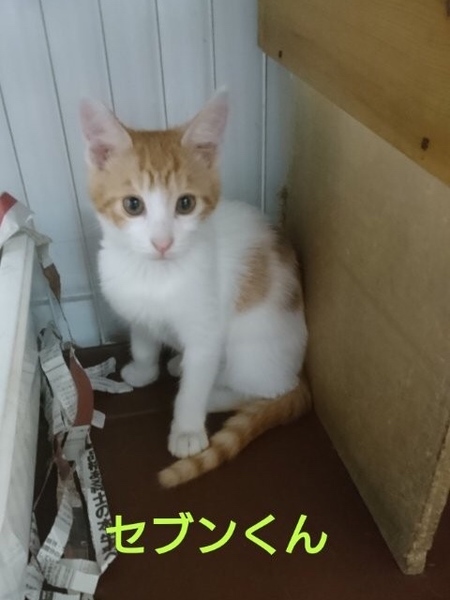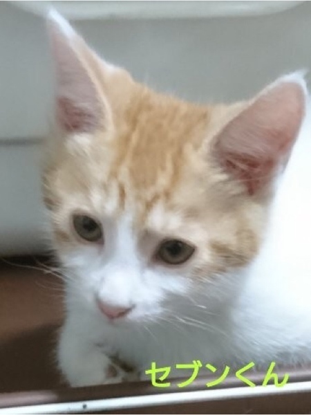 | 特徴(性格など) | 仮名「セブンくん」 ワクチン済み、駆虫済み、ウイルス検査白血病、エイズ共に陰性 白茶の男の子 好奇心旺盛な甘ったれ男子です。 人に寄ってきてはジャレて遊びに誘います。 月齢が浅いので兄妹または月齢の近い子と2匹での受け入れをお願いします。 小学生以上でしたらお子さんのいるご家庭でも大丈夫です。。 レビンくん C311611 マークくん C311613 と兄弟です。 小学生以上でしたらお子さんのいるご家庭でも大丈夫です。 お留守番が短いお宅を希望します。 |