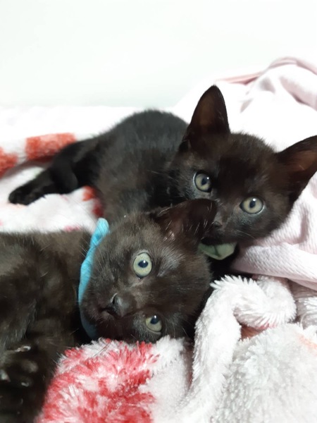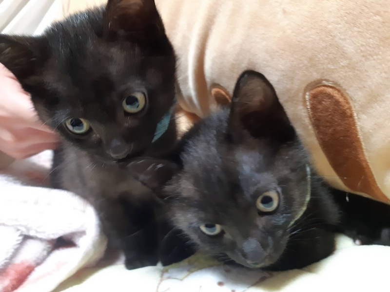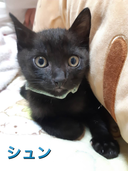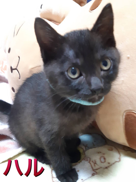 | 特徴(性格など) | 黒猫兄妹です。センターに収容されミルクと離乳を職員さんにお世話になり成長しました。 2匹ともとっても人懐こく、撫でるとゴロゴロペロペロと可愛い子達です。 2匹一緒のお家を希望しています。 シュン(♂) ハル (♀) |