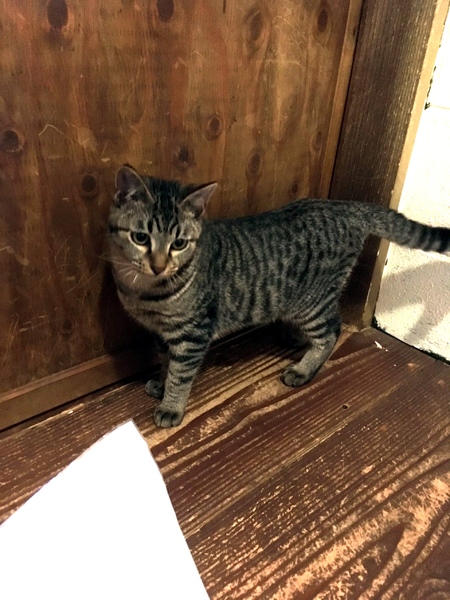 | 特徴(性格など) | すらっとしたスタイルのキジトラ君です。しっぽはまっすぐ。 食べることが好きなのか、ごはんの準備をすると一目散にやってきて食べます。 おもちゃで遊ぶよりも、隅っこに隠れたり兄弟や他の猫と遊ぶことの方が好きみたいです。(猫じゃらしは一人で遊びたい派らしい……) |