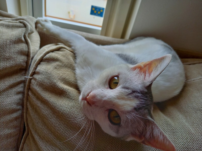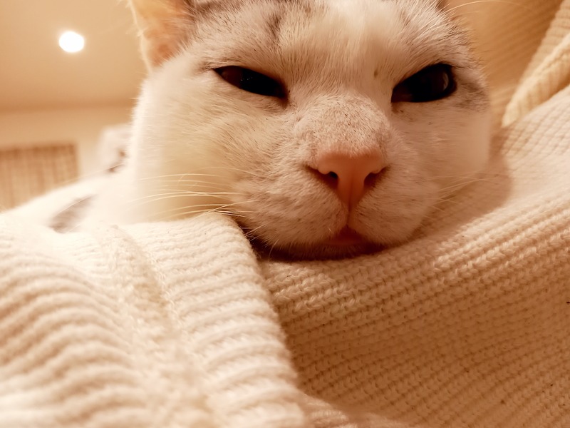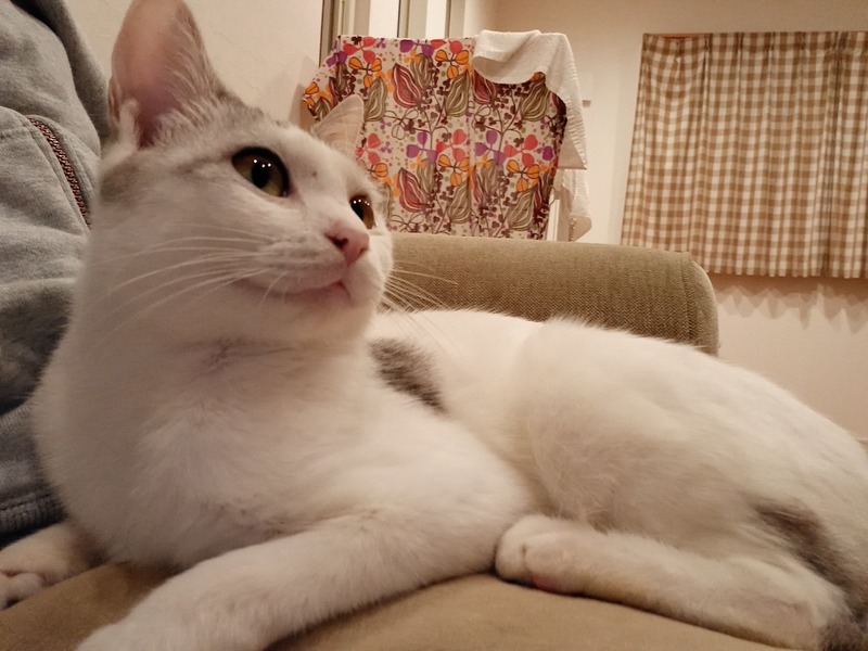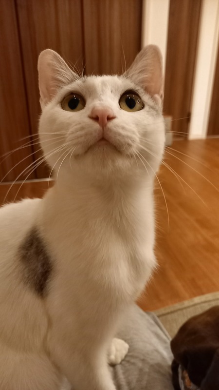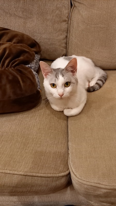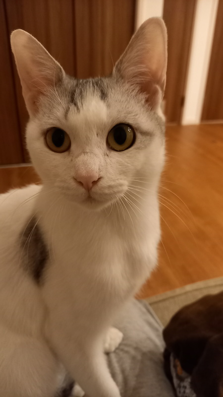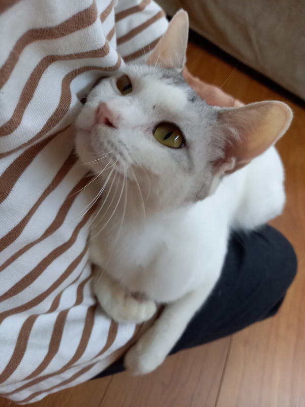 | 特徴(性格など) | 少し人見知りでビビり。初めのうちはシャーすると思いますが必ず慣れます。話しかけると必ず返事をしてくれて、お膝が大好きな甘えん坊さん。猫じゃらしや鈴のボールで遊ぶのが大好きです。サバシロ、尻尾はまっすぐ長いです。 |