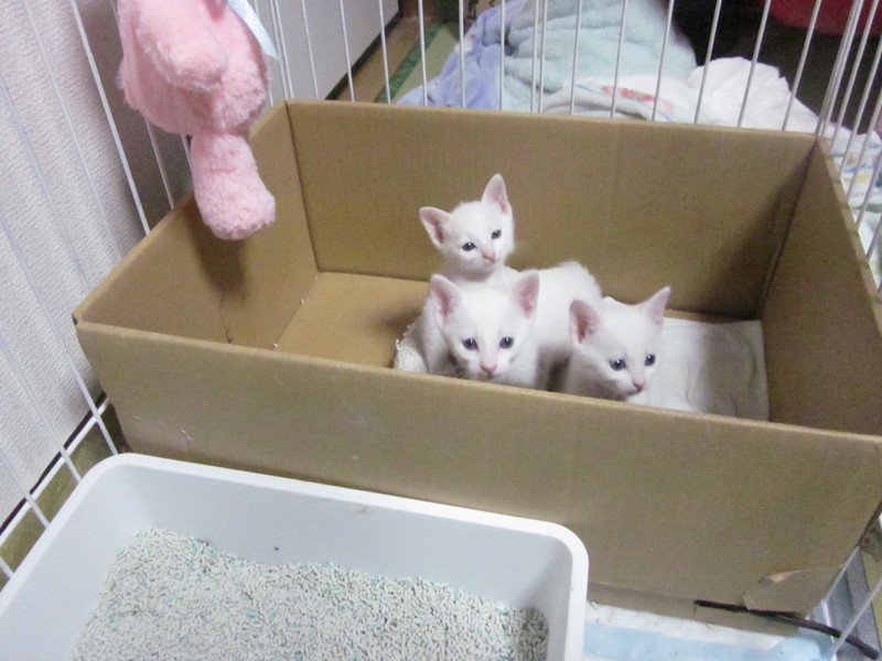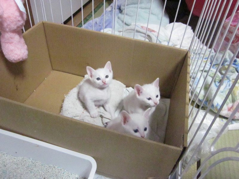 | 里親募集する理由 | 2020年9月15日朝、生まれたばかりの3匹の白い子猫が自宅玄関に箱に入れられて置き去りされてました。 警察にも相談しましたがただの拾得物です。 85gしかなく育て切れる自信は、0%でしたが、協力下さる方も在って、必死の思いでやっと大きくなりました。 私は高齢で身体も不自由です、我が家には過去保護した猫が12匹居ます。 日々奮戦、苦戦の現況にあります。 |