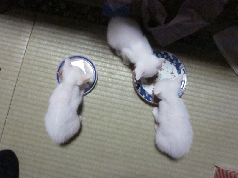 | 特徴(性格など) | 3匹とも真っ白です。元気でとても奇麗で可愛いです。体重は個体差が有って500g~550gです。 目が青く黒くとてもキレイです。とても懐っこく私が若いなら3匹とも一緒に人生を送りたいと思いますが・・・。私はどんな動物もどんな猫も可愛くしかみえません。 |
