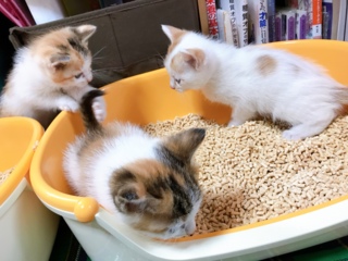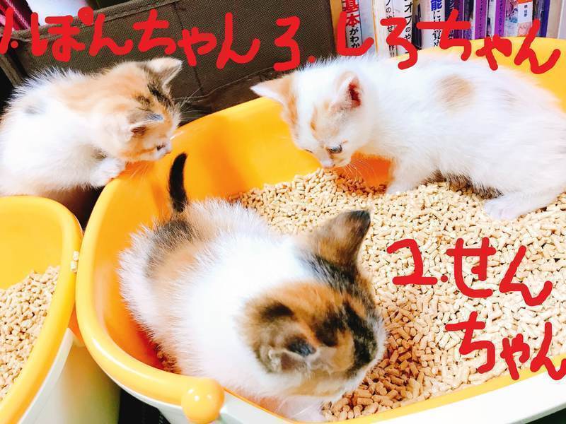 | 特徴(性格など) | 3匹の里親さんを募集中です。 3匹とも元気いっぱい。部屋の中を走り回ったり、兄弟でじゃれあったりしています。 トイレしつけ済み、ドライフードに移行中。 1.ぽんちゃん(メス) 黒、茶色、白 ※ 里親決定!!里親さんの下へ巣立っていきました。 わんぱくさんの1匹目。 窓によじ登るのが大好きな男の子です。 2.せんちゃん(メス) 黒、茶色、白 ※トライアル中 わんぱくさんの2匹目。 3匹のなかで一番好奇心旺盛です。 1.ぽんちゃんとじゃれあうのが好き。 3.しろちゃん(オス) 茶、白 ※里親決定!!里親さんの下へ巣立っていきました。 少しびびりでおしとやかな男の子。 兄弟といると、走るスピードがとっても速くなります。 |