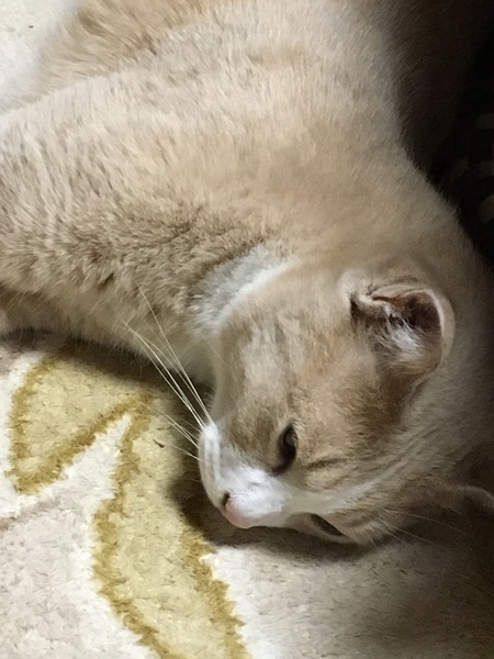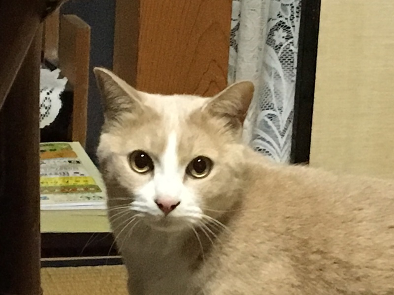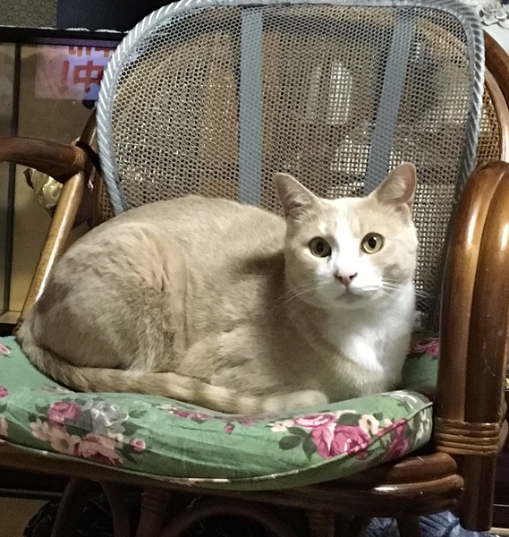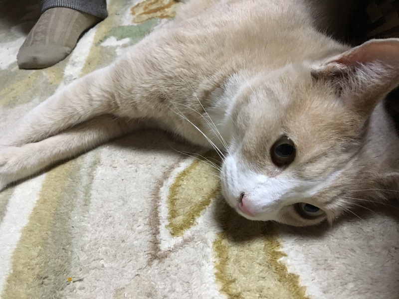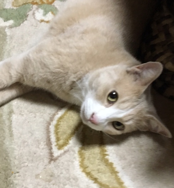 | 特徴(性格など) | ノラネコが母の足元へ置いていき託されて、目が開く前からミルクで人口飼育をしたため、ベタ慣れで人間を全く怖がりません。 すぐに膝にも乗ってきて、スキンシップ大好きな男の子です。 毛色 ベージュ&ホワイトに薄いトラ模様 性格 温厚です |