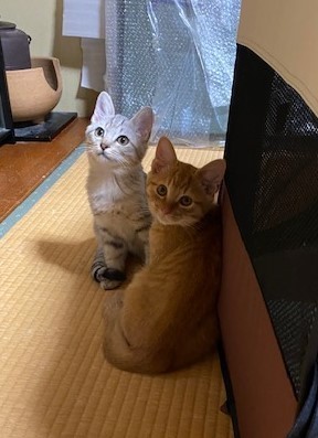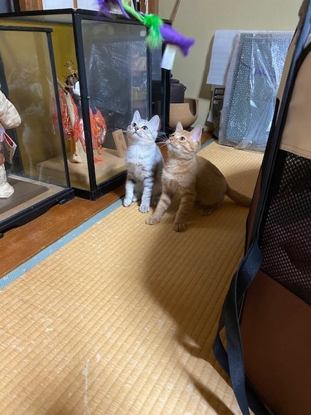 | 特徴(性格など) | チャトラとグレートラ兄弟です。 尾長でとても可愛いお顔です。 空き家で野良ママと2ヶ月半暮らしていました。 人馴れしていません。 猫保護部屋に親はケージに入れ、兄弟は放しています。 人お見ると逃げます、人が居ない時に食事します。 ワクチン済、健康診断済み、猫エイズ白血病陰性です、、体内外の駆虫済です。 人馴れして居なく人が入ると逃げて走り回ります。 猫の飼育経験長く、気長に対応できる方。 |