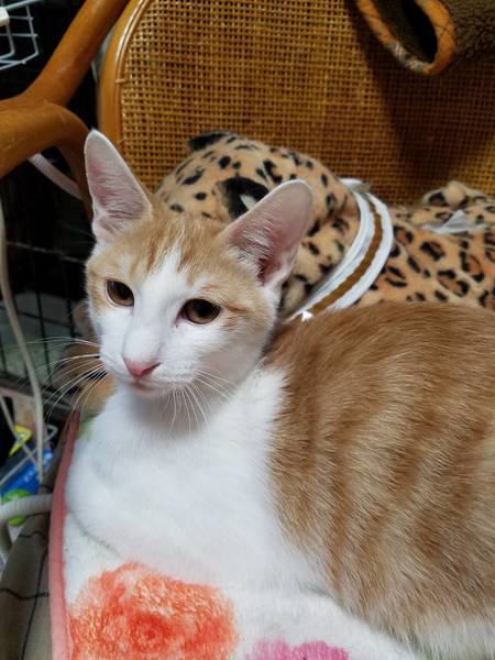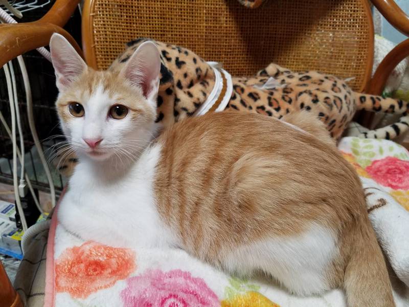 | 特徴(性格など) | 本当にスフィンクスみたいに薄い毛質の茶白柄。乳飲み子よりの飼育により、穏やか人馴れしてます。兄弟のルネちゃんと一緒の募集です。 トライアル期間あります。 |