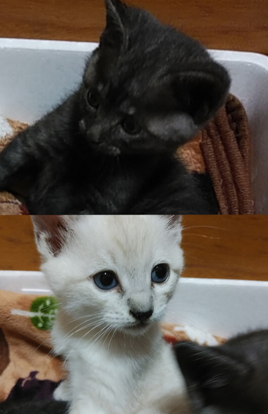 | 特徴(性格など) | 黒猫ちゃん(メス)は 少しグレー色混じりです。 人懐こく一緒に遊んだりします。 白猫ちゃん(オス)は好奇心旺盛で 少しわんぱくですが、賢い子です |