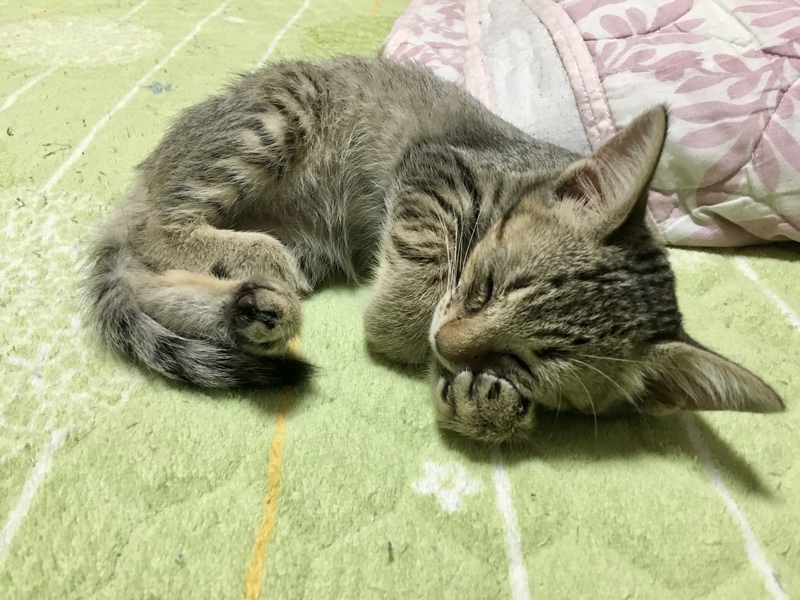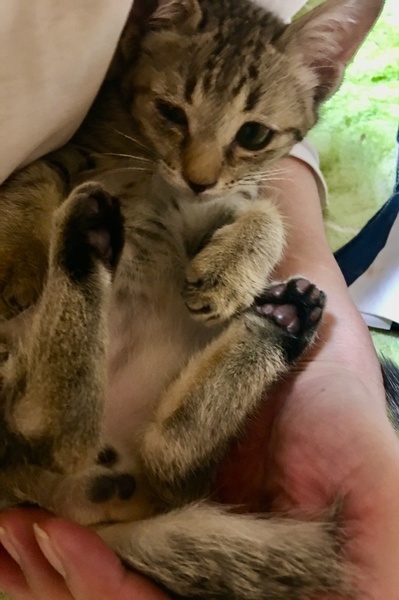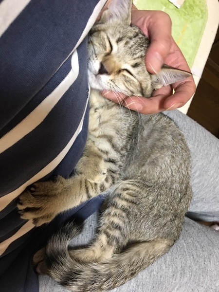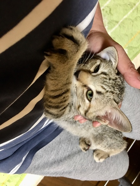 | 特徴(性格など) | 何故か1回やったシリンジでの水を気に入って、シリンジを見せると飛んできます^_^普通に水入れの水も飲みます。 縞の無いキジ、手足と尻尾の先には縞あり。 9月20日に保護した時は骨盤肋骨背中の骨がゴツゴツ分かる程痩せて脱水に目鼻は風邪によりほぼ塞がっていました。ノミも3匹ほど見えて、ノミの糞も全く無くて耳の中も綺麗だったので飼い猫の遺棄かと思います。 直ぐに甘えて来て腕枕で寝たりゴロゴロ言うのですが大きな音などにビビリます。涙目鼻水くしゃみの治療に長引きましたがネブライザーでピカピカになりたした! |