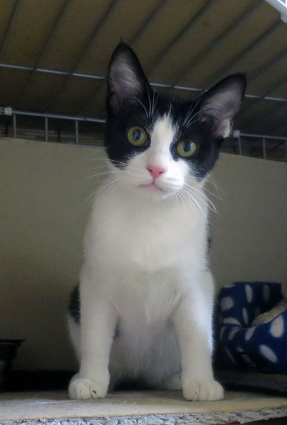 | 里親募集する理由 | 公園の奥の方から鳴き声が聞こえるので見に行くと、白黒の子猫が鳴いていました。 臆病な子らしく、近づくのが10メートルほどの距離になると飛んで逃げます。 最初は野良母さんが一緒にいると思ったのですが、毎晩同じ場所で鳴いているので違ったようです。 毎晩餌を持って行き、臆病な子のようなので怖がらせないように時間をかけて慣らしました。 そのうちに何とか近寄ってくるようになり、ある日突然足元をゴロゴロと転がるようになったので、人の手でここまで大きくなった子のようです。 こういう人慣れした子は捨てられて子でしょうか・・・多分そうでしょう。 慣れるとすぐに抱けるようになったので、保護して里親さんを見つけてやることにしました。 |