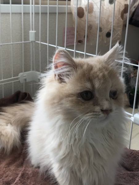 | 特徴(性格など) | ノルウェージャン、色はベージュの男の子です。推定5か月。 左目が猫風邪からの結膜炎で、瞬膜が出たままになり癒着しています。 麻酔下でないと切開できないので去勢手術時に処置をすれば、より美猫くんになると思います。 性格はおっとりで甘えん坊、すぐゴロゴロ言います。最近活発になってきました。ブラッシングもさせてくれます。 |