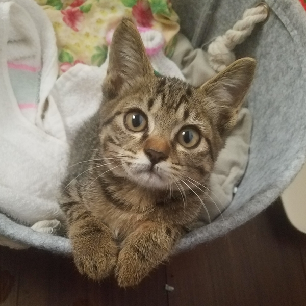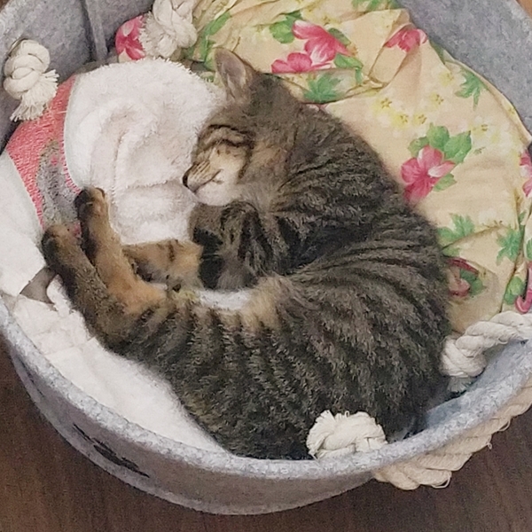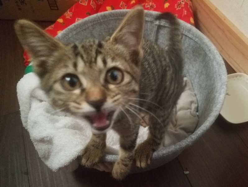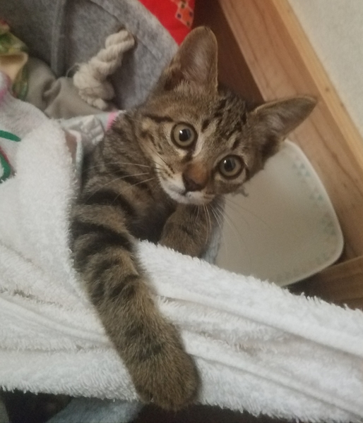 | 特徴(性格など) | キジトラの男の子です。 真っ直ぐでしゅっとしたしっぽに額のM字柄がとってもキュートです。 性格は甘えん坊で撫でられるのが大好きです。近づくとゴロゴロと喉を鳴らします。 ご飯もたくさん食べて、元気いっぱい遊んでいます。 トイレもきちんと出来、夜鳴きもしないお利口さんです。 保護した時には、左前足の爪のひとつが折れており、現在外用薬で治療しています。 ・ノミダニ駆除済 ・虫下し済 |