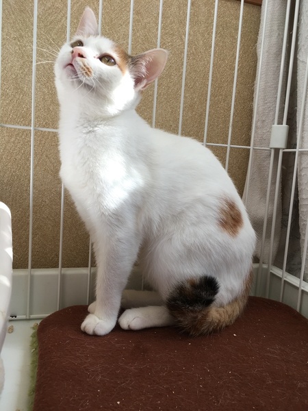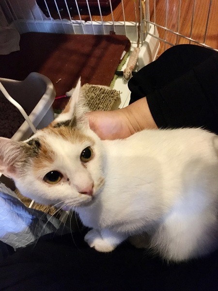 | 特徴(性格など) | 春生まれの白三毛ちゃんです。 8月下旬に保護してから2ヶ月、だんだん慣れて楽しくなってきました。お世話している人には慣れて膝に乗ります。 お転婆ちゃんです。 |