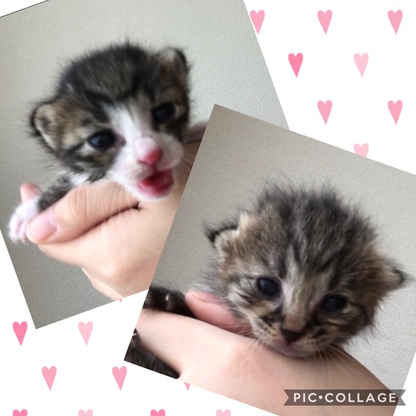 | 特徴(性格など) | 一生懸命鳴いて生きようとしています。二匹で寄り添って寝ています。本当に可愛いです。 シロキジトラ鼻がぴんくのほうが、声が大きく、動きも多いです。段ボールをよじのぼり、どこまでも這って歩いていきそうです。哺乳瓶で飲めないのでスポイトでミルクをのませています。 キジトラ鼻が黒いほうが、控えめな感じですが、鳴き声がぴんくちゃんに比べて高くて可愛いです。 哺乳瓶で上手にチュパチュパ吸えるようになってきました。こちらは毛がフワフワしています! |