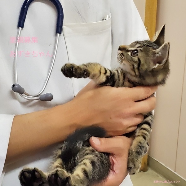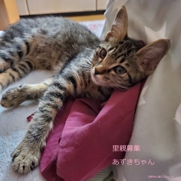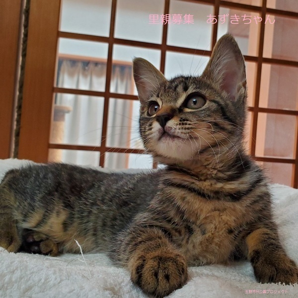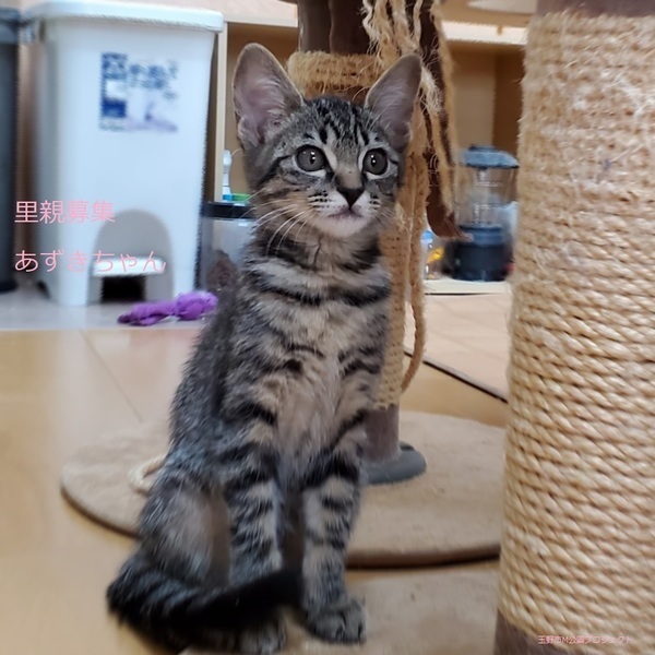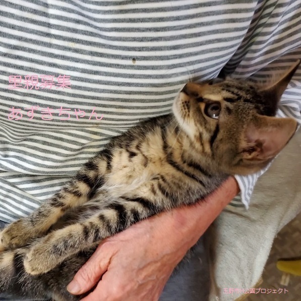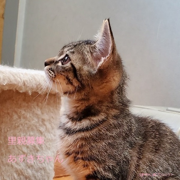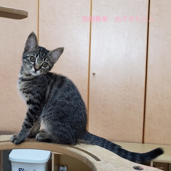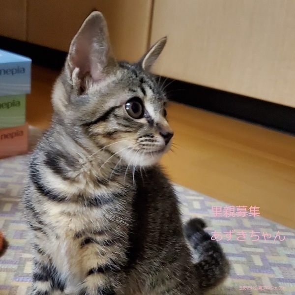 | 特徴(性格など) | キジトラ子猫、女の子、仮名:あずきちゃん 推定生後3ヵ月くらい、体重:1kg(10/21現在)、 健康診断済み、駆虫済み(ブロードライン10/19)、 血液検査-エイズ・白血病-共に陰性(10/21) 初回三種混合ワクチン接種(10/21) トイレしつけ済み ちょっぴり怖がりですが、慣れるとゴロスリの甘えん坊です。活発で走り回ってよく遊びます。 11/20、三種混合ワクチン追加接種済み。 2021.1/22.避妊手術済み。 |