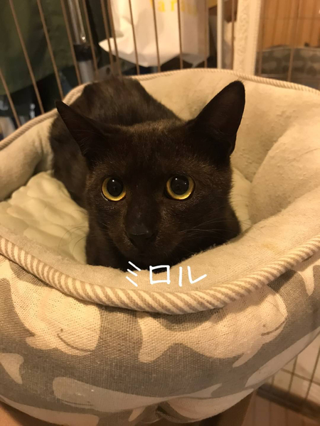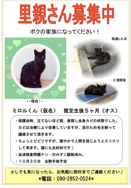 | 里親募集する理由 | 保護当時、立てないほど衰弱し、全身カビの状態でした。 保護した小学生が喘息になり、自宅でも保護ができなくなった為、知り合いの店のバックヤードで保護してもらっている状態です。 医療費に関しては、治療・去勢手術等かかりましたが、ミロルくんを生涯家族の一員として、室内で飼っていただける事を優先に考え、請求しないつもりです。 |