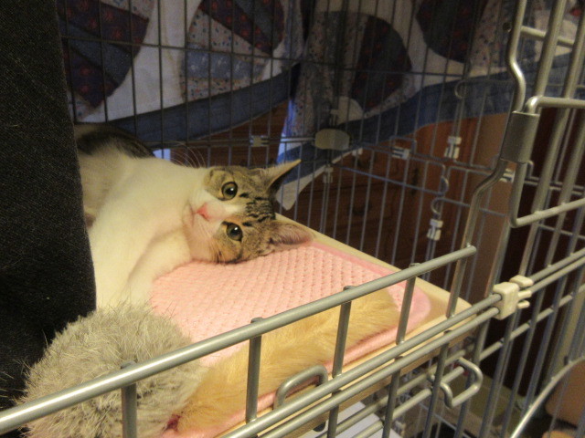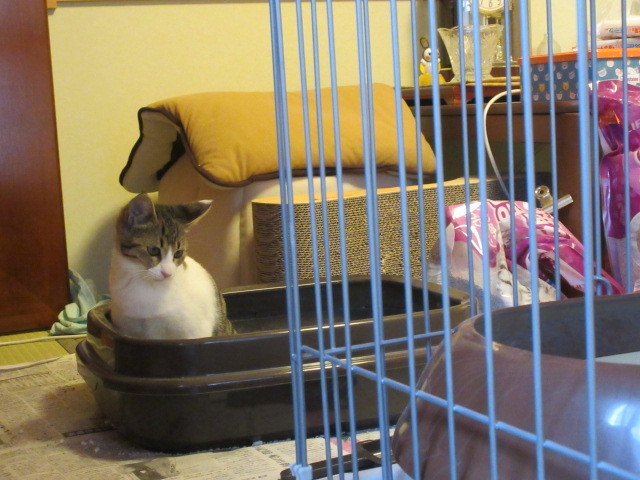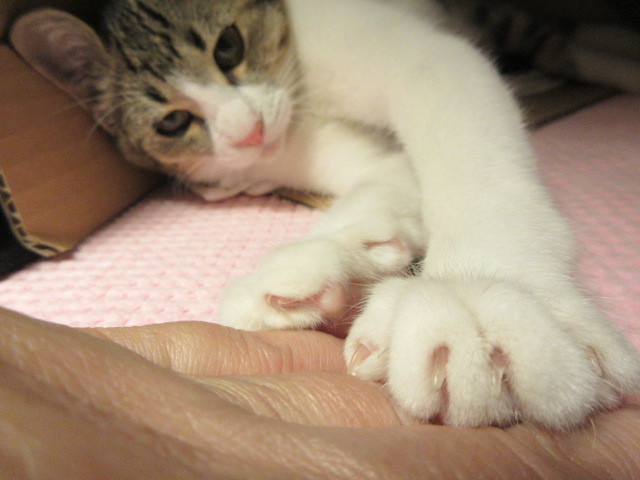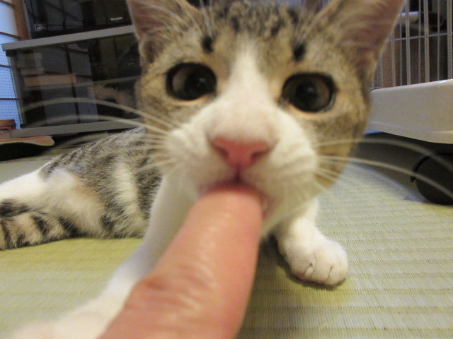 | 特徴(性格など) | キジ白柄。1.7キロ(10月23日)生後3~4ヶ月位。 保護時は、タンスの裏に籠城していたので菜箸にアイスの棒を付けてチュールを15分位かけて 舐めて貰いました。それが、仮名=アイスちゃんの由来です。 まだまだ怖がりさんですが、11月2日現在はゴロゴロ言いながらフミフミするまでになりました。 おトイレは保護初日から、失敗無しのお利口さんです。 羽のオモチャで遊ぶのが大好きで、可愛い声の素敵にゃんこさんです。 |