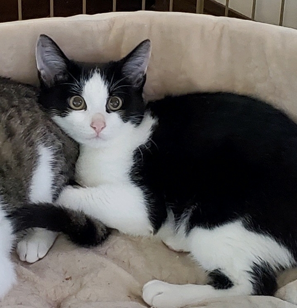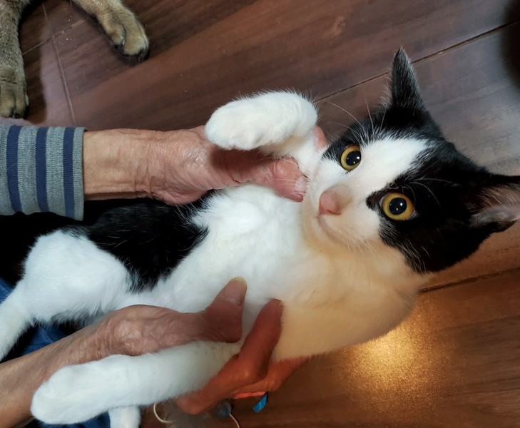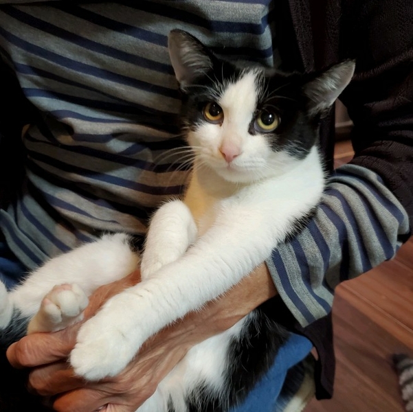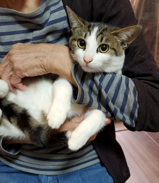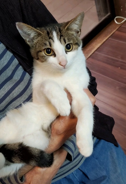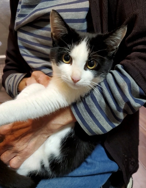 | 特徴(性格など) | フワフワで丸顔の白黒ハチワレ女の子 かわいい白キジのハチワレ女の子。 健康状態良好、食欲旺盛です。 少し人見知りなところはありますが、おとなしく抱っこされています。 |