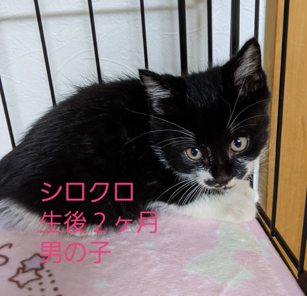 | 特徴(性格など) | 6匹のシロクロ兄妹のうちの1匹です。 保護時は固まってましたが、今は遊んだり甘えて来たりと馴染んで来てます。 ワクチン一回済み 駆虫済み |