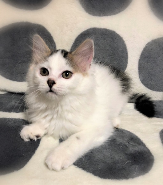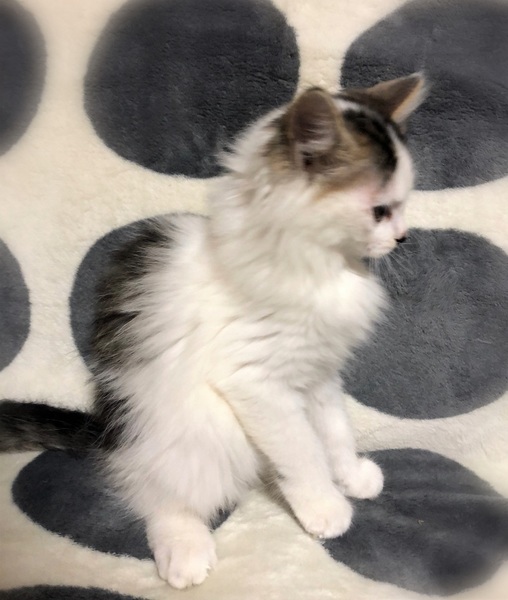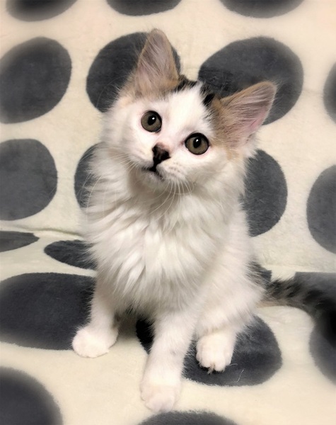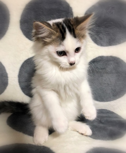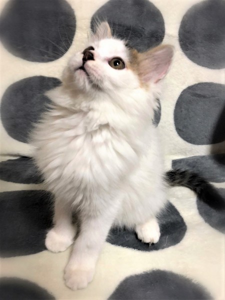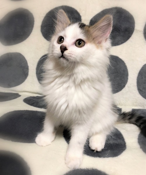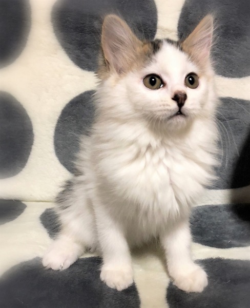 | 特徴(性格など) | 仮名、かてん ふわふわの長目被毛・キジ白女の子 慣れない場所では緊張しますが、甘えん坊さん。 遊ぶ事が大好きで、元気に走りまわっています。 甘えたくなると、もくもくと毛布に潜り込んで来ます。 |