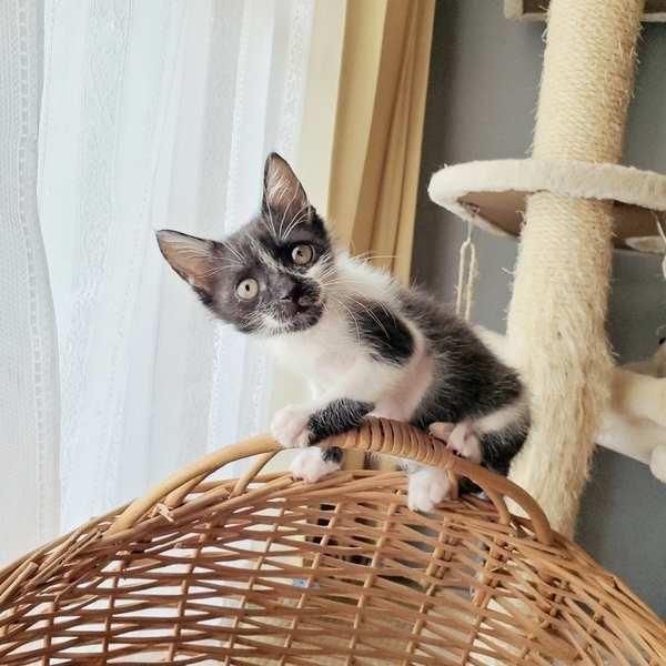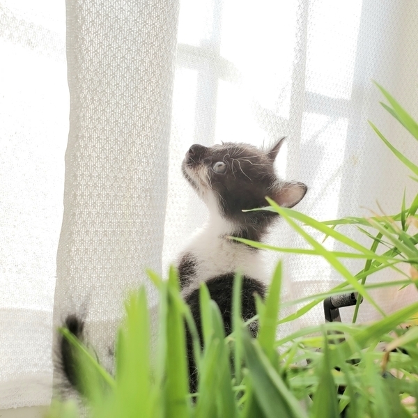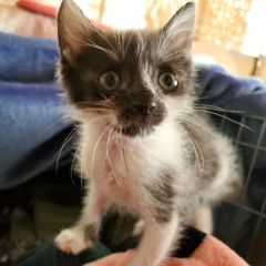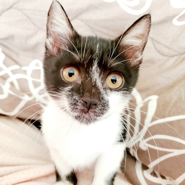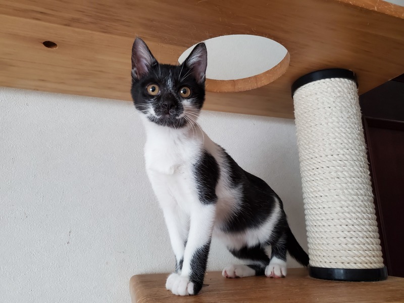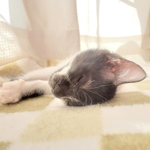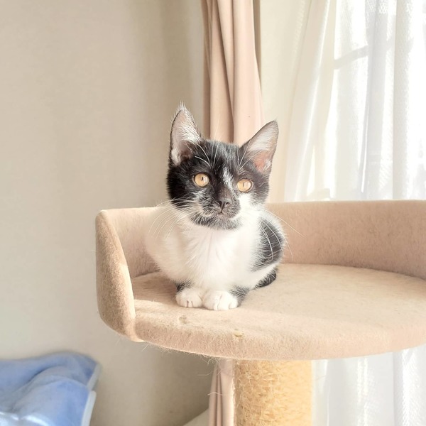 | 特徴(性格など) | 誕生日2020年9月15日頃。 性格はわんぱくで、元気いっぱい走り回っています。 生後2週間程で保護しましたので人慣れしています。 模様はしろくろ。 お顔が個性的で、黒地にひとすじの白いラインが走っています。 健康状態は良好、食欲旺盛です。 ・ノミダニ駆虫済 ・血液検査陰性 ・ワクチン2回済 ・去勢手術は月齢が足りてからとなります |