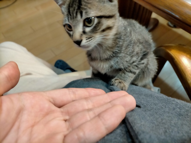 | 特徴(性格など) | 生後一月ぐらいの時に、母猫とはぐれて鳴いているところを保護しました。 甘えん坊のサバトラで、人懐こいです。膝の上に乗ってきて、指を吸うくせがあります。 爪切りは簡単にさせてくれます。病院に連れて行くときも暴れず、かなり飼いやすい方だと思います。 ネコ白血病、ネコエイズ陰性 検便済み、ノミとコクシジウム駆除済み 三種混合ワクチンを1回接種 その他、重大な病気なし ご希望の場合、子猫のキャリーケースをお付けします。 |
