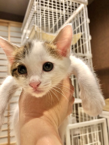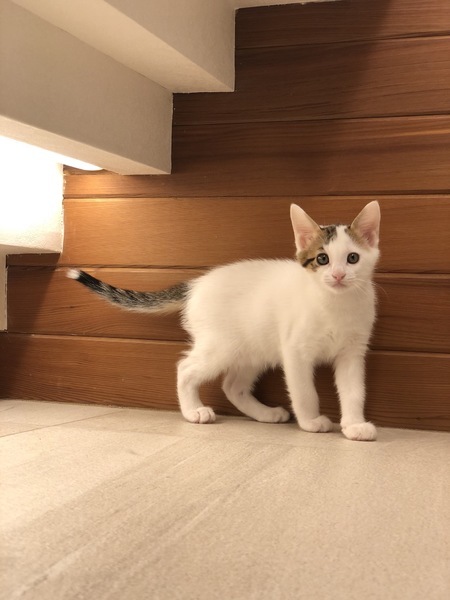 | 特徴(性格など) | 体は白に頭の所に茶とグレーの柄がはいっています。 尻尾はグレーの虎柄です。 ウィルス検査は白血病、エイズウィルス共に陰性でした。 3匹産まれた中で1番ビビリさんですが、ボール遊びが大好きで、女の子みたいに可愛いイケメン猫ちゃんです。 |