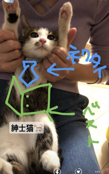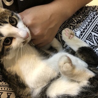 | 特徴(性格など) | 生後1.5ヶ月くらいから餌やりさんが手懐けていたため、かなり人馴れしています。 (0歳児、3歳児とも1週間ほど暮らしましたが、爪を立てる事もなく遊んでいました) 現在は預かりさんのもとでたくさん遊び、たくさん甘えて、膝の上でぐっすり寝ちゃう天使のような子です♪ お腹にネクタイとベストのような柄があるため、英国紳士のシャーロックと呼んでいますw 獣医さん、ペットホテルのオーナーまでもがメロメロになるほどのアイラインばきばき!愛嬌抜群の超絶美猫です! |