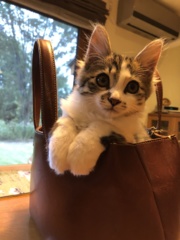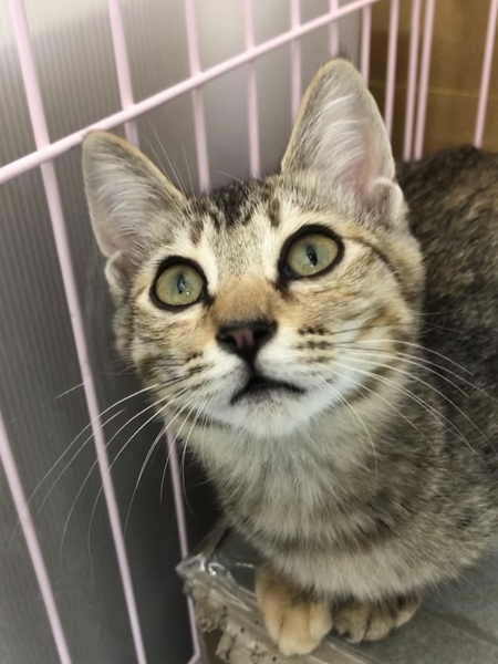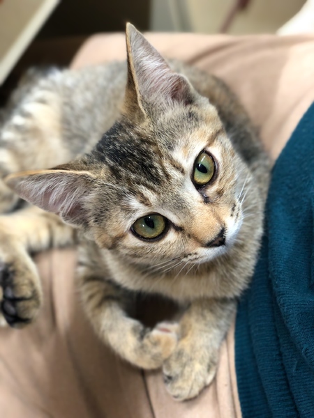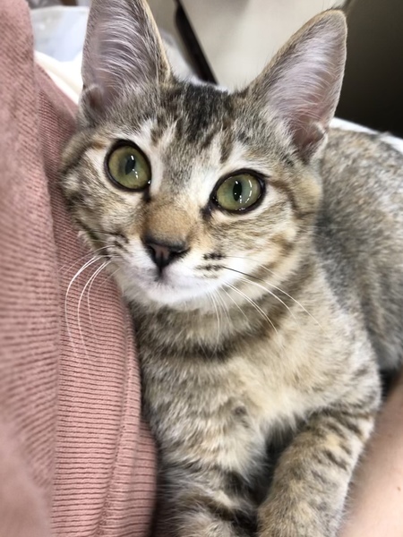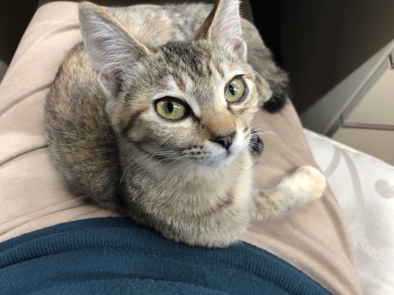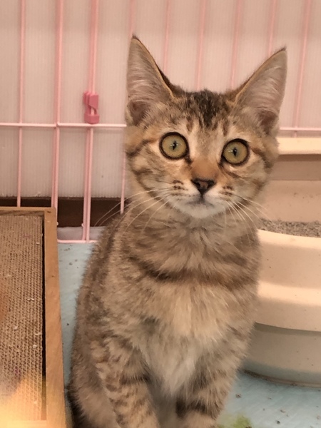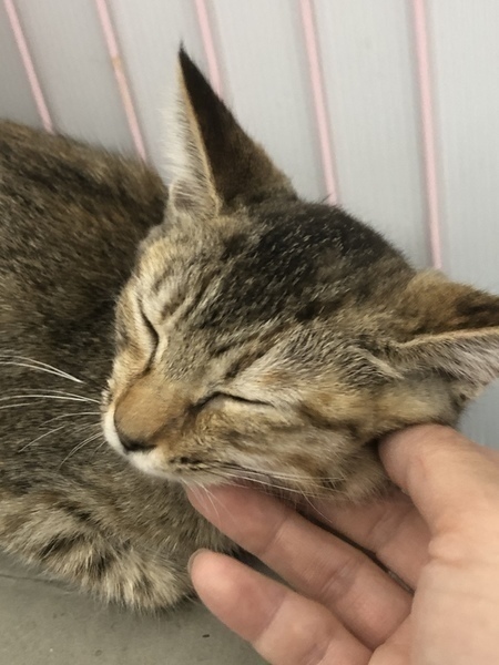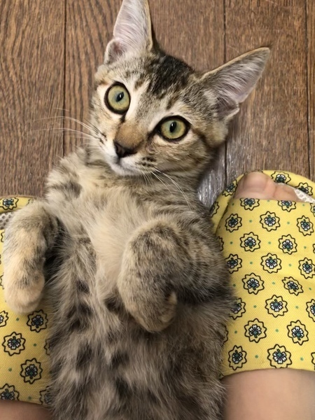 | 特徴(性格など) | なでるとすぐにゴロゴロとのどを鳴らし、お腹を出して甘え、うれしそうに見つめてきます。人が大好きな子になりました。保護前の環境からは考えられないくらい、人を信頼してくれています。 顔まわりをなでると、ウットリとした表情をし、もっと撫でてとすりすりし、指を甘噛みしてくれます。おもちゃでも楽しく遊べるようになりました。 大きな目が特徴的な、キリッとしたキジトラの女の子です。瞳はグリーンです。 しっぽは長いですが、先が幸運を引き寄せるカギしっぽになっています。早く幸運を引き寄せたいと里親さんを待っています。 |