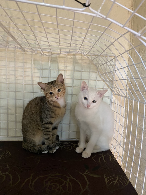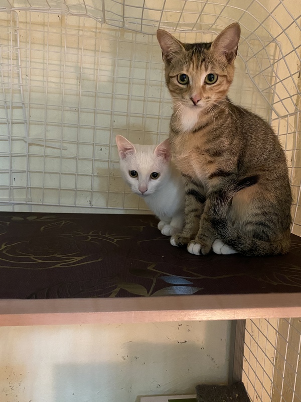 | 特徴(性格など) | 白猫もキジトラも人には慣れています。キジトラの方が活発で、白猫はおとなしいです。 キジトラはややオレンジがかった色です。 |