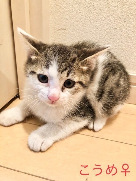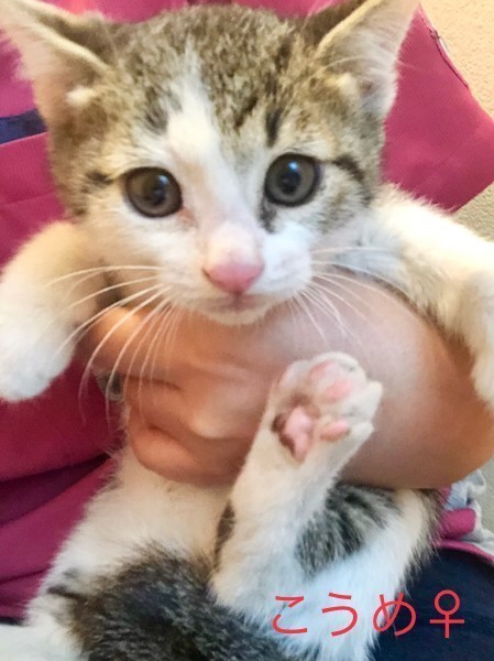 | 特徴(性格など) | ■特徴(仮の名前:こうめ) キジシロ 推定2.5ヶ月 体重850g ■性格・暮らし ・普段はケージの中で生活しています。 ・ケージでの就寝、お留守番が出来ます。 ・子猫の為、お留守番が少ないご家庭。 ・中心となってお世話する方が60歳以下、2人以上のご家庭。 ・1年以内に避妊手術をし、証明書を提出していただける方。 ・兄妹2頭(げんき&こうめ)で譲渡可能な方。 ■今までに行った医療行為 ・混合ワクチン11月11日一回目 ・マイクロチップ装着 ・猫エイズ猫白血病検査(陰性) ・ノミダニ体内寄生虫駆除薬(ブロードライン)塗布 ・駆虫薬投与 ■今後行う予定の医療行為 ・混合ワクチン ・避妊手術 |