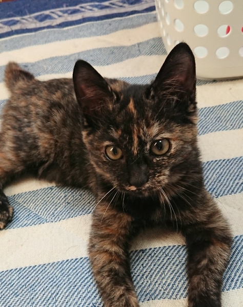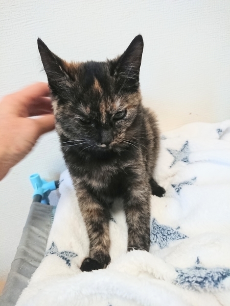 | 特徴(性格など) | マイペースで甘えん坊な女の子。 おもちゃを追いかけてコロコロと良く遊びます。 黒が多めの綺麗なサビ猫さんです。 |
