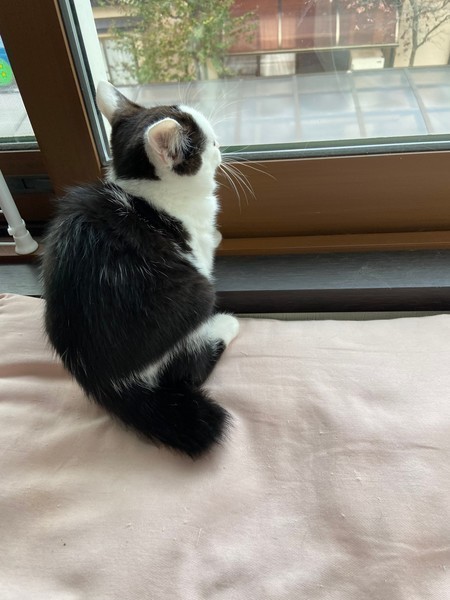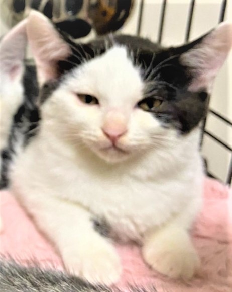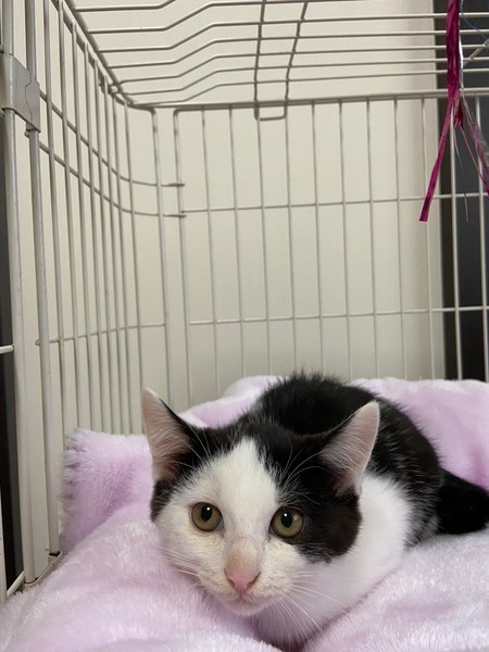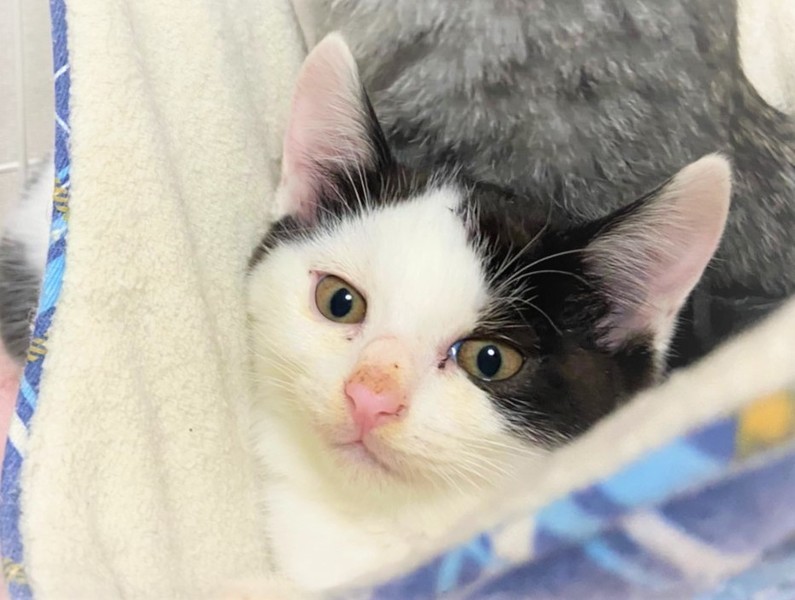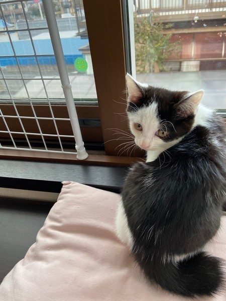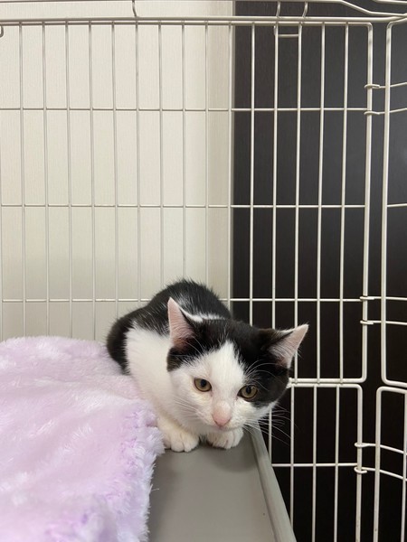 | 特徴(性格など) | 2020.8.23生まれ(推定) 毛色:白黒 白黒ハチワレ、素敵な七三ヘアーの可愛い女の子♡ 4姉弟の中で一番ビビリでいつも皆んなの後ろに隠れてしまいます。 こんな子程、心を許した人には甘えん坊に変身間違い無しです♡ 皆んなの様子を伺いながら、コッソリと遊ぶ姿が健気で愛らしいタイムちゃんです!! |