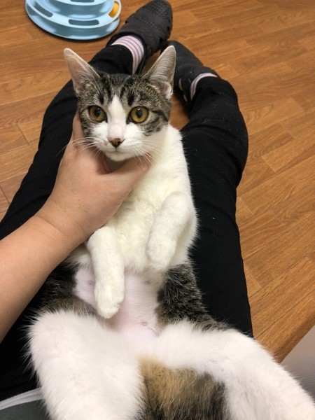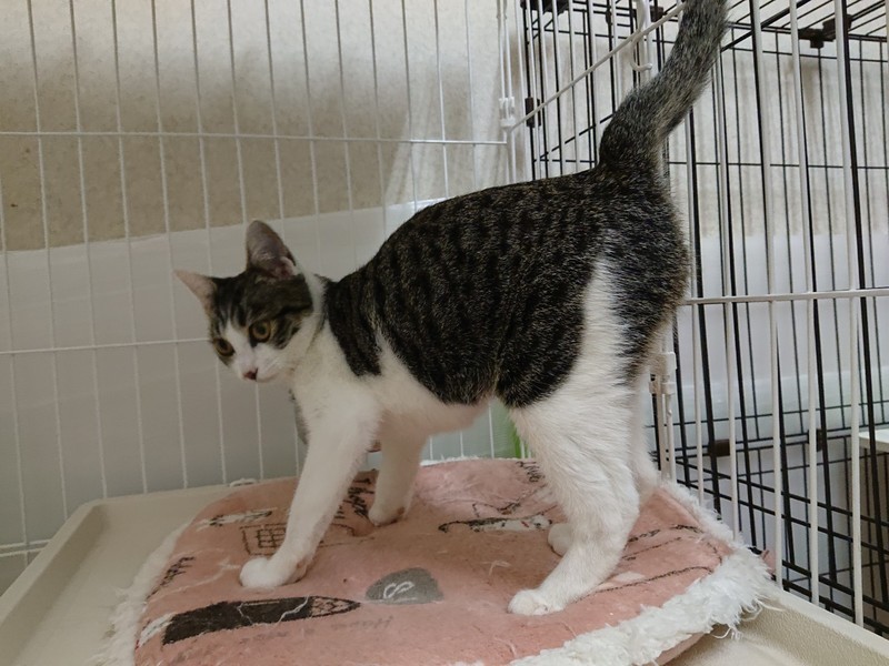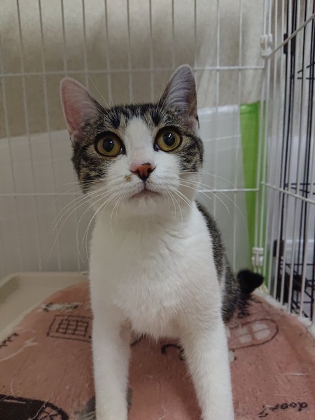 | 特徴(性格など) | 2020.5.1生まれ(推定) 毛色:キジ白 元気いっぱいのキジ白女子のふみかちゃん。 真ん丸おめめがとっても印象的!! 長~く伸びた尻尾の先は、クルっと曲がった幸せのカギしっぽの持ちさん。 抱っこが大好きで、いつも誰かに甘えていたい!! 「あたちここにいるの~~~!」と、構ってアピールする姿が可愛すぎます♡ ケージの柵をよじ登ってみたり、近くにあるものをチョイチョイと手繰り寄せてオモチャにして遊んだりと、おてんばさんな面もありますが、一番好きなのはやっぱり抱っこ♪ オモチャそっちのけで、足元でスリスリゴロゴロ~甘えてきてくれます。 |