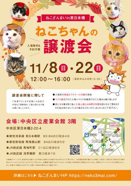 | その他(譲渡条件など) | 【新型コロナウィルス感染予防対策について】 譲渡会開催に際し、ご来場下さいます皆様には以下の内容をご理解頂き、ご協力頂けます様お願い申し上げます。 ●入場前の検温とアルコール消毒の実施 ●マスク着用でのご入場=マスク未着用でのご入場はお断り致します ●入場人数の制限=一度に入場できるのは50名迄とさせていただきます ●時間と人数の制限=密になる事を防ぐ為に入場人数とお時間の制限を設けさせて頂きます その為お待たせしてしまう場合もございます ●会場利用規約により、ご来場者様の連絡先を控えさせていただきます あらかじめご了承下さい 里親様決定は14時以降となります。 その後、迎え入れ準備の説明等のお時間も頂戴しますので、お時間に余裕を持ってご来場下さい。 諸々の制限がございますが、安心・安全な譲渡会運営のためにご理解・ご協力いただきますようお願い申し上げます。 ~~~~~~~~~~~~~~~~~~~~~~~~~~~~~~ ★仔猫ご希望の里親様★ 仔猫ちゃんたちは、まだ体がしっかりしていない赤ちゃんです。 下痢だけでも数時間対応ができなかっただけ死に至る事もあります。 その為、月齢に応じたお留守番時間を設けさせていただいております。 また、子猫ちゃん(6ヶ月未満)の里親様には子猫支援金のご協力をお願い致しております。 ★猫ちゃんとのお見合いは譲渡会で!★ ねこざんまいの猫ちゃんは譲渡会でのお見合いのみとなります。 『この子はいつ譲渡会に参加するの?』『譲渡会場の場所はどこ?』など はねこざんまいホームページをご覧ください。 https://neko3mai.com/ ★楽しく猫ちゃんと触れ合って★ ねこざんまい譲渡会は、猫ちゃんも里親様も保護主も笑顔で過ごせる譲渡会を目指しています。 これから20年以上、楽しい時も、悲しい時もいつも傍にいてくれる大切な家族になる猫ちゃんです。 会場には沢山の猫ちゃんがいます。 1匹1匹、触れ合って猫ちゃんとお話ししてください。 『初めて猫ちゃんを家族に迎える方』 『先住猫ちゃんのお友達を迎える方』など トライアルの仕方や先住猫ちゃんと仲良くなるコツなど経験豊富な保護主やスタッフにお気軽にご相談ください! 猫を愛し、そして猫に愛されている猫好きスタッフと保護主がアドバイスさせていただきます。 ★里親希望のみなさまへ★ ペットではなく、家族一員としてたっぷり愛情を注いでくださるご家庭をお待ちしております。 恐れ入りますが、 ・学生の方 ・一人暮らし、同棲中の方 ・子猫、若猫希望の60歳以上のみのご家庭 ・脱走防止対策にご協力いただけない方 は原則譲渡を遠慮させていただいております。 ただし、預かりボランティアさんとして新しい家族が決まるまでの間、猫ちゃんを預かっていただく道もございます。 参加猫ちゃんは、それぞれ保護主(実際に猫ちゃんを自宅に入れ、保護をしている方)が異なります。 詳しい条件なども異なる場合がございますので、会場内で直接保護主とお話ください。 〖共通条件〗 1.終生飼育 2.完全室内飼い 3.脱走防止対策へのご協力 4.避妊去勢手術 5.契約書類へのサイン 6.定期報告 7.医療費等の負担 当日の猫ちゃんを連れて帰ることはできません。後日、保護主が里親様のご自宅までお届け致します。 その為、移動の際の猫ちゃんの負担を月齢などから考慮し、お届け地区を限定させて頂くこともございますのでご了承ください。 ご理解とご協力のほど宜しくお願い致します。 ☆よくある質問☆ ・譲渡の条件 ・ご負担頂く費用 ・譲渡会の場所等は ホームページに詳しく掲載させて頂いておりますのでご覧ください。 https://neko3mai.com/ メールでのお問い合わせはすぐにご返答出来ない場合がございますのでご了承ください。 ホームページ https://neko3mai.com/ お問い合わせ http://www.neko3mai.com/contact/form_general.html ねこざんまいブログ http://ameblo.jp/neko3mai/ |