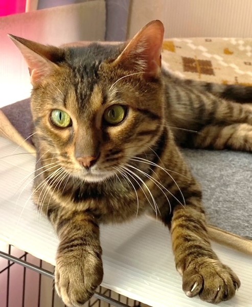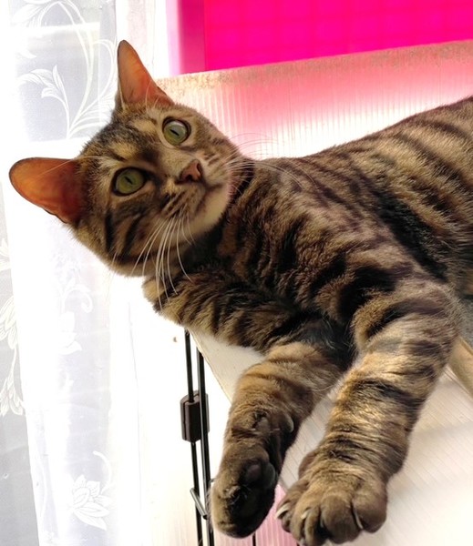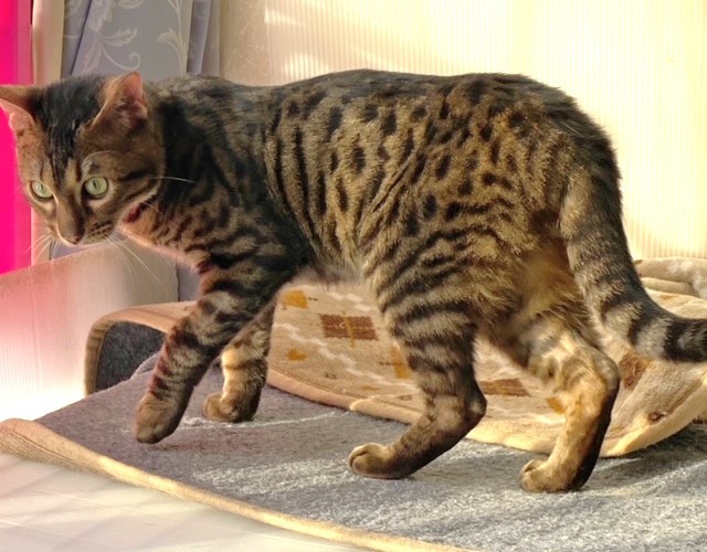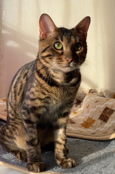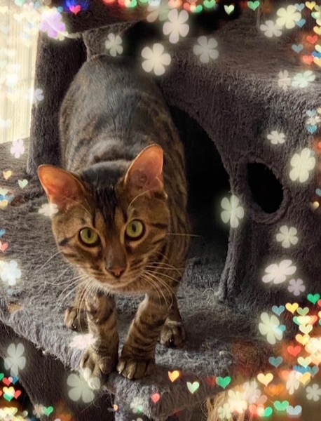 | 特徴(性格など) | ベンガルの男の子になります。毛色はブラウンのヒョウ柄です。 最初は少し人見知りしますが、すぐに慣れてくれました。運動能力が高めですばしっこいです。キャットタワーなど上下運動の出来る遊具が必要になります。 健康状態は現在良好です。 |
