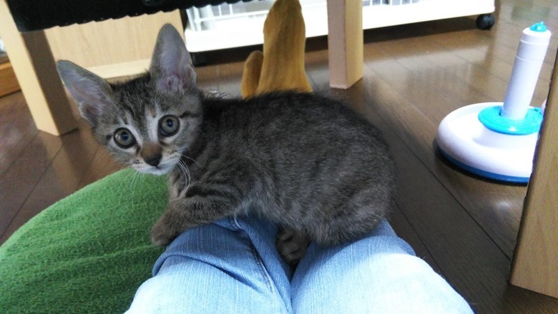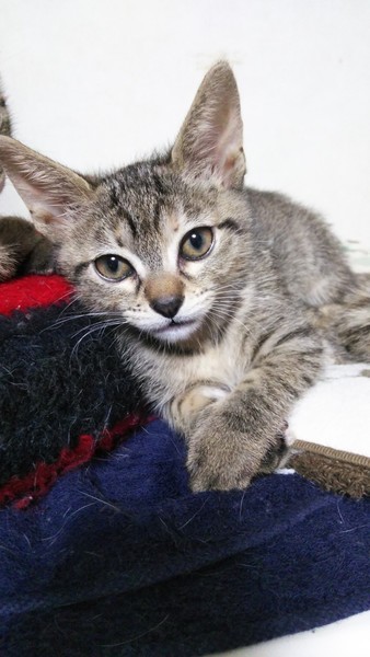 | 特徴(性格など) | 2020.8.31生まれ(推定) 毛色:キジトラ しっぽの長いキジトラの女の子。 甘えん坊で座っていると、膝に乗ってきます。 タンスの上やケージの上等高い所のクッションでウトウトするのが大好きです。 兄妹で追いかけっこをしたり、転がるおもちゃを追いかけて遊ぶ元気いっぱいな女の子です♪ |