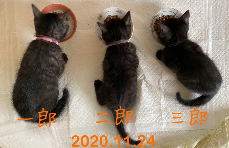 | 里親募集する理由 | 有志でTNRを進めている公園に遺棄されました。 最初に一郎くんが遺棄され、保護したその4日後に二郎くんと三郎くんが一緒に遺棄されました。 そっくりなので同腹の兄弟と思われます。 3匹とも生後3週で保護(体重300g) |