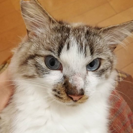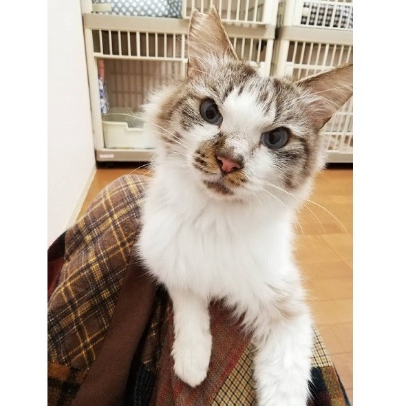 | 特徴(性格など) | シャムカラーのやや長毛種、綺麗なブルーアイ 洋猫風なのに、尻尾だけジャパニーズボブテイル 性格は、甘えん坊のおしゃべり好き、やんちゃっ子なワガママ王子^^ 保護した当時は、ケージから出て来られないほど固まっていて怖がりでしたが・・・ いまや、肩や背中に飛び乗ったり、人の顔や首を抱きしめてキス攻撃をしてきたりと、ラブアピールが激しいです(笑) シャンプーもおとなしくさせてくれるとっても良い子ですよ♪ |