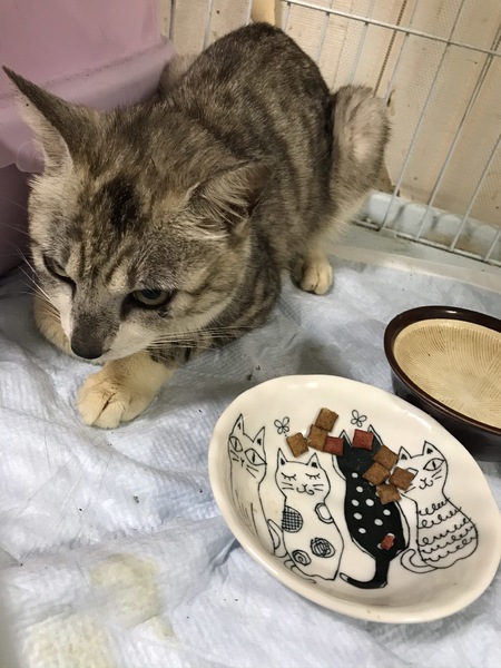 | 里親募集する理由 | 夜な夜なコンビニ にきて窓の虫を捕まえて 食べていたとの話しを聞き 不憫に思い罠で保護しました。 痩せておりガツガツしばらく食べて いまは正常な体重になりました。 |