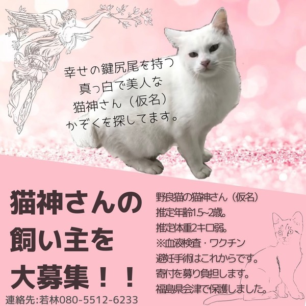 | 里親募集する理由 | 東京と福島県会津を行き来して仕事をしています。今年6月に会津に社宅を借り住み始めた日、玄関をトントンと叩くような音がしたのでドアを開けると、この白い猫さんが訪ねてきました。我が家では既に先住猫が2匹おり、私と一緒に移動を繰り返す生活をしているため、さすがに3匹は難しく、私はこの子を家族にしてあげられません。どうかこの白猫さんを家族に迎えて生涯大切にしてくださる方を探しています。会津の冬は厳しく冬を越せずに命を落とす子が多い地域です。現在チームで動いており、譲渡費用の募金も募っております。猫神さまと呼んでいるのは、あまりにも神がかった行動をする子だからです。生きることに一生懸命なのでしょう。現在はやや警戒心が強めではありますが、愛情を注いでいただけるご家族とご縁があれば以前のような優しい子になるはずです。よろしくお願いいたします。 | ||