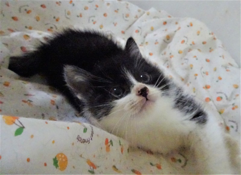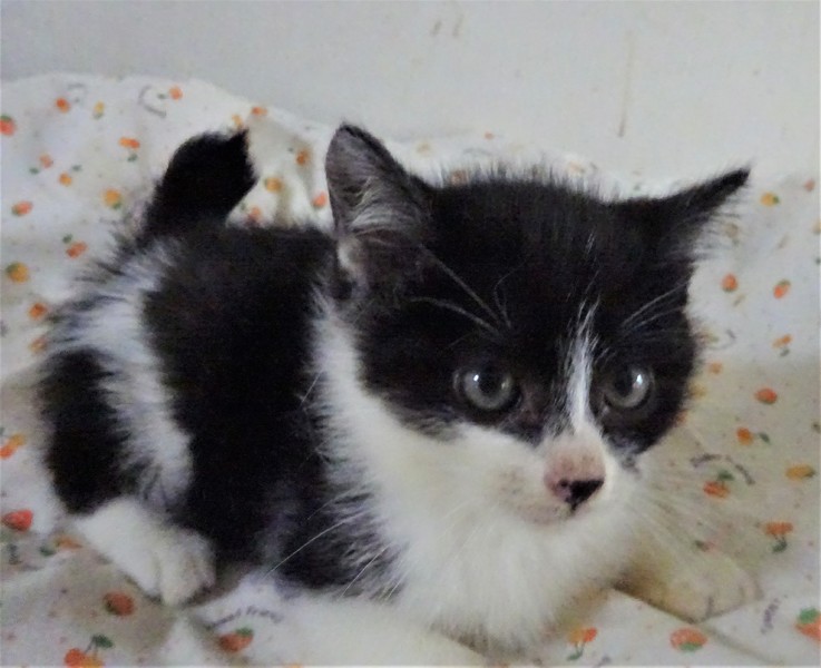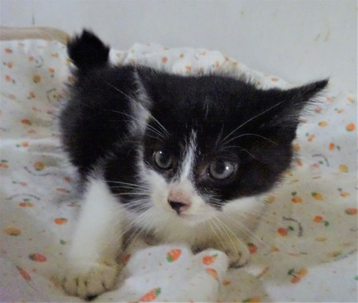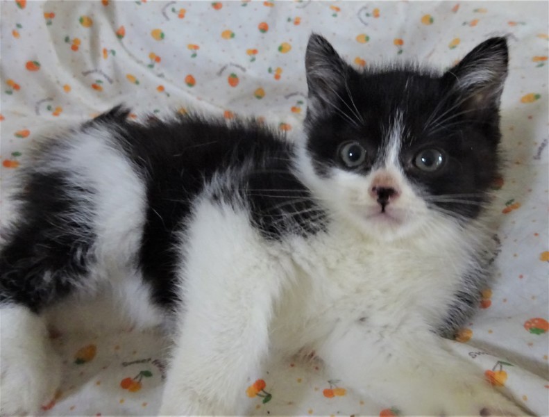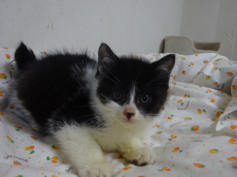 | 特徴(性格など) | 仮名: つららくん(オス) 毛色: 黒白、尻尾短め 性格: 子猫なので、はっきりとした個性はわかりませんが、3兄弟の中で一番小さく、末っ子だと思います。 少し怖がりの所もあり、大人しいですが、にゃんプロは好き。 でも小さいので下になつて鳴かされています。 抱っこなどは平気です。 兄弟のふぶきくん、しぐれくんの内の誰かと一緒のお家が希望です。 留守時の安心の為にケージをお使いになることをお勧めします。 ノミ取り済 検便済 駆虫済 3種混合ワクチン済 猫エイズ・白血病ウィルス検査は共に陰性です |