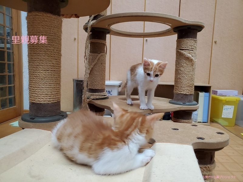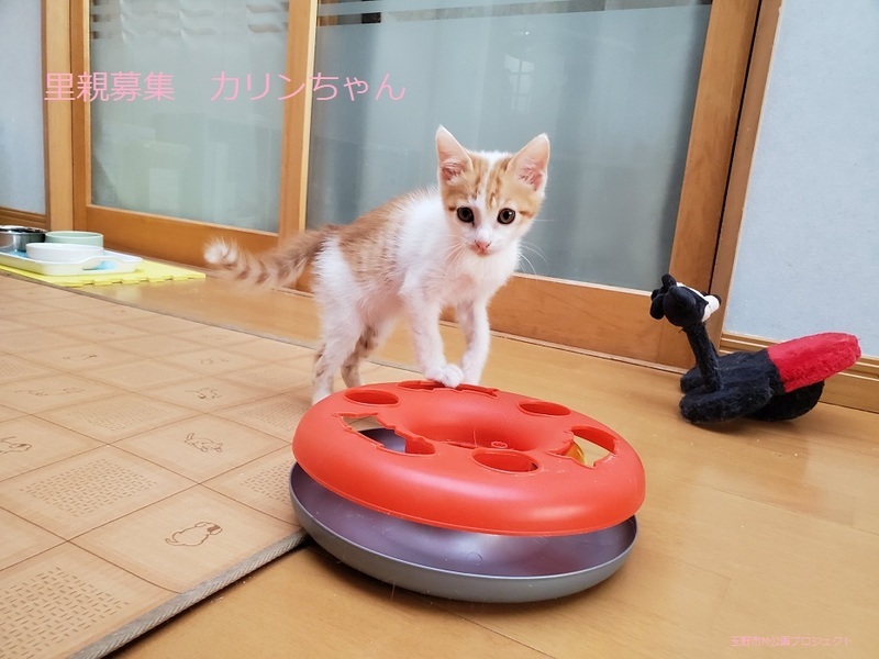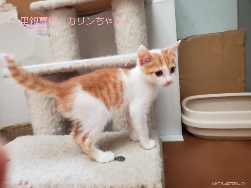 | 特徴(性格など) | 白茶子猫、女の子、仮名:カリンちゃん 推定生後2ヵ月くらい、体重:700g(11/24現在)、 健康診断済み、駆虫済み(レボリューション11/25、ドロンタール11/27)、 血液検査-エイズ・白血病-ともに陰性(12/1兄弟代表でパインくんで実施)、 初回三種混合ワクチン接種(12/1)、 トイレしつけ済み、 人慣れしています。活発で好奇心旺盛です。兄弟のパインくんとよく遊びます。 |