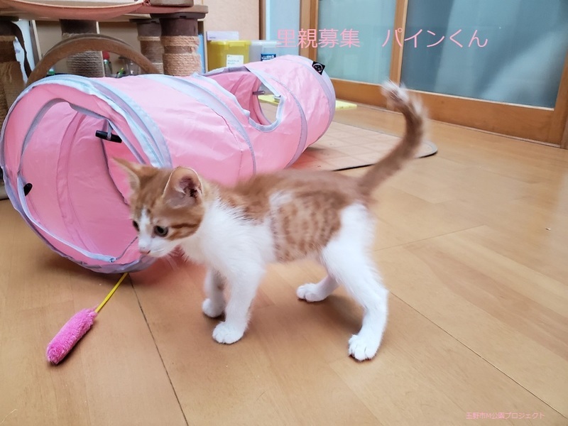 | 特徴(性格など) | 茶白子猫、男の子、仮名:パインくん 推定生後2ヵ月くらい、体重:780g(11/24現在)、 健康診断済み、駆虫済み(レボリューション11/25、ドロンタール11/27)、 血液検査-エイズ・白血病-ともに陰性(12/1)、 初回三種混合ワクチン接種(12/1)、 トイレしつけ済み、 人慣れしています。活発で好奇心旺盛で兄妹のカリンちゃんとよく遊びます。 |