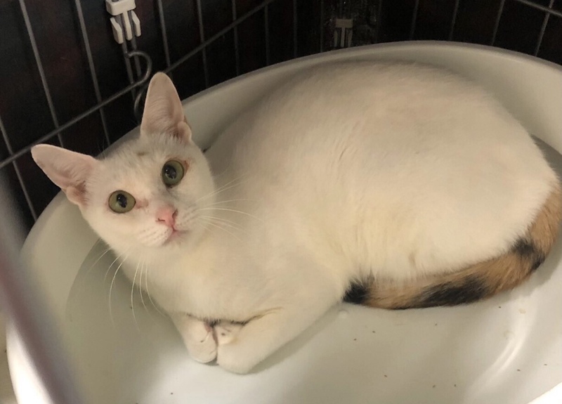 | 特徴(性格など) | 元々は飼い猫です。 出産直後、保健所に収容されたお母さん猫です。 子供達は既に離乳して引き出されました。 ほぼ全身が真っ白で、尻尾のみ三毛です。 子猫がいなくなってから、ビビり猫になりました。 |
