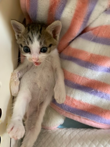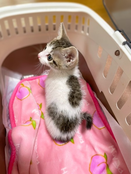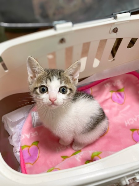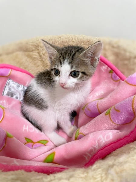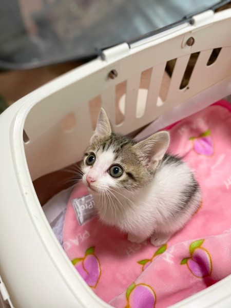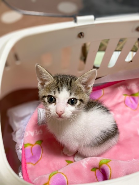 | 特徴(性格など) | 白キジ柄の女の子です。 ミルクから預かりボランティアさんが育ててくれました。 おっとりした性格でとても可愛い顔をしています。 他の子猫も多数保護しています、是非見に来て下さい。 |