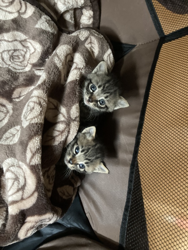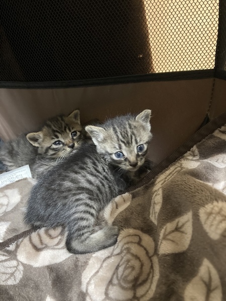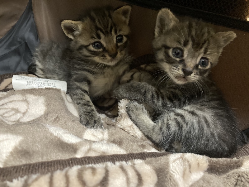 | 特徴(性格など) | 縞模様がかわいいオスとメスの生後2週間くらいの子猫です!! オスの子はよく眠っていますがお目目が丸くてかわいいです! 少し毛色が茶色っぽい部分もあります! メスのこもかわいいお顔をしています! しっぽが先天性なのか切れてしまったのかわかりませんがありません! |