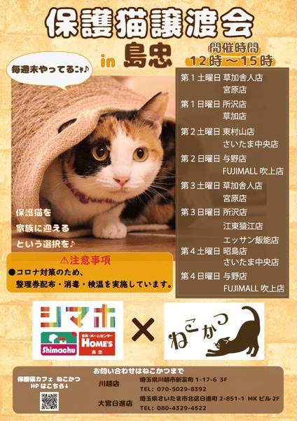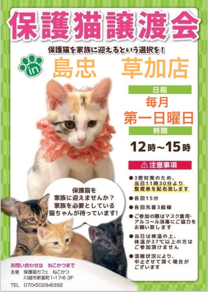 | その他(譲渡条件など) | ◆譲渡条件 〜*〜*〜*〜*〜*〜*〜 当日、猫の体調次第でお休みする場合がございます。 ご了承ください 〜*〜*〜*〜*〜*〜*〜 *譲渡会場へお越し頂ける方。 *猫可の住環境で、脱走防止対策・完全室内飼育をして頂ける方。 *終生愛育をお約束頂ける方。 *初期医療費のご負担を頂ける方。 *ご自宅へお届けを了承して頂ける方。 *譲渡誓約書にサインを頂ける方。 *ご希望を頂きましても、猫の性格と生活リズムが合わないと判断した時はご遠慮させて頂く場合がございます。 ご了承ください。 〜*〜*〜*〜*〜 *整理券の配布があります。 *検温・マスク着用・アルコール消毒にご協力ください。 *荒天の場合や混雑状況などで中止の可能性もあります。 ご了承くだい。 ★12:00~15:00 ★各回人数制限あり |