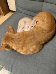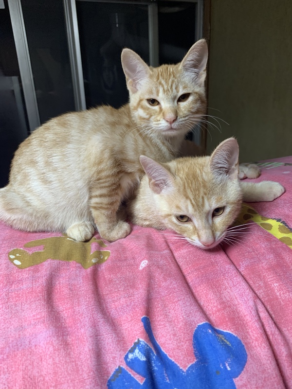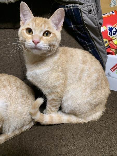 | 特徴(性格など) | 薄茶色の猫です。よく走り回りキャットフードやおやつをたくさん食べよく寝ます。 2匹とも綺麗で可愛い顔をしています。 2匹とも少しビビリな性格ですが座っていると横にきて寝ることがよくあります。 ワクチン未接種、不妊去勢手術しておりません。ノミダニ駆除はしております。 トイレの躾はしていますが、たまにどちらかがおしっこだけ失敗することがあります。(理由は模索中) オスとメスです。 最後の写真は睨んでるみたいになってますが、寝起きの写真です!! |
