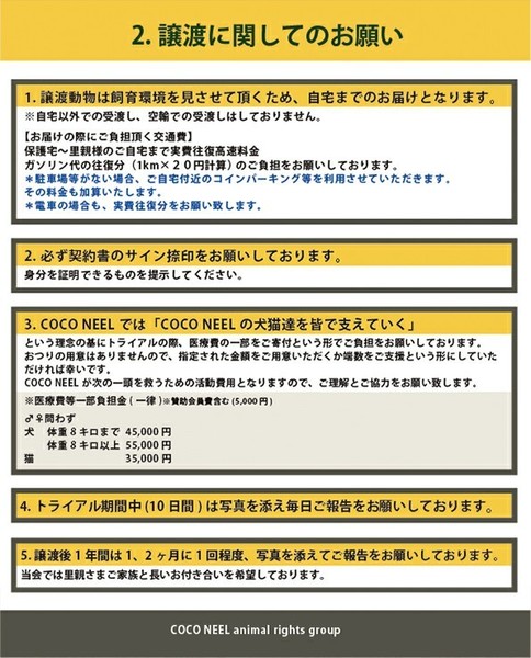 | 譲渡費用(医療費、交通費など) | 医療費負担金 40,000円 賛助会員費 5,000円 預かり宅からの交通費(ガソリン代、高速代)は別途請求させていただきます。 |