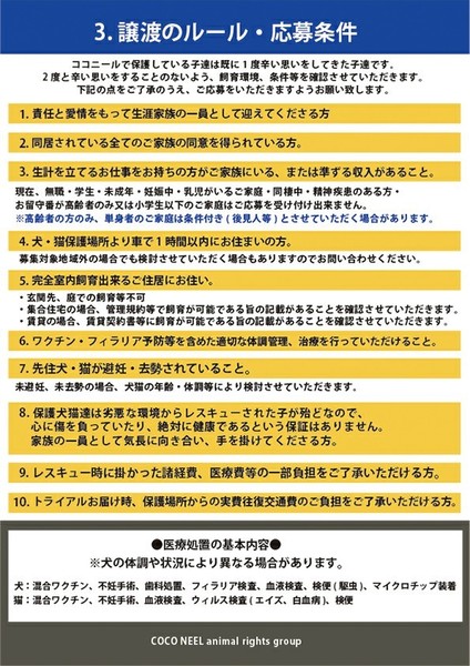 | その他(譲渡条件など) | 預かり宅より1時間以内をお届け目安とさせていただきます ✱応募方法✱ ※いつでも里親募集中からのご応募は受け付けられません。 里親希望の方は、以下のURL又は画像に記載の『譲渡のまでの流れ』『譲渡のルール・応募条件』『譲渡に関してのお願い』のご確認のうえ、『里親希望エントリーフォーム』よりご応募お願い致します。 ※お返事には1週間程度のお時間が掛かる場合があります。 『譲渡のまで流れ』 https://coconeel.wixsite.com/website/bosyunonagare 『譲渡に関してのお願い』 https://coconeel.wixsite.com/website/blank-4 『譲渡のルール・応募条件』 https://coconeel.wixsite.com/website/blank 『里親希望エントリーフフォーム』 https://coconeel.wixsite.com/website/entry ※ご質問等ある場合は、フォームの最後の欄にお書き添えください。 ※先着順ではありません。 犬の性格・年齢・病気等を考慮し、多方面から検討させていただきます。 |